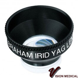 A 10mm diameter, 66D magnifying button in the anterior surface of the lens is positioned over the peripheral iris to give a clear view of the iridectomy site. Laser efficiency is increased compared with using no lens. The lens also helps stabilize the patient's eye and retains the eye lids.