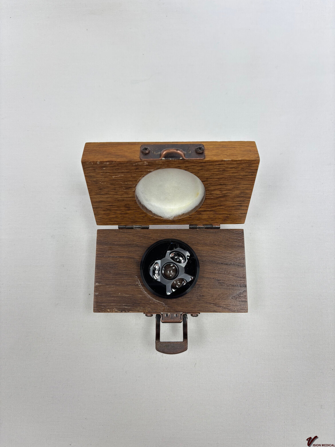 This classic "Goldmann" type lens has three mirrors angled at 59°, 67° and 73° to permit viewing of the peripheral fundus and anterior chamber angle. 36° of the posterior pole can be viewed through the center of the lens.